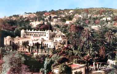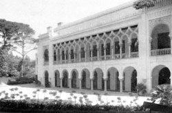 On y avait une vue imprenable sur la courbe majestueuse de la baie d'ALGER. Il avait fallu déjà bien des travaux pour transformer la simple villa qui en 1830, appartenait au ministre des haras du Dey ; Le duc d'AUMALE en avait d'abord fait une demeure " à l'européenne ", en 1846, et avait ajouté une série de dépendances mais les pièces s'avérèrent trop exiguës et il devint impossible de séparer les appartements privés et les bureaux officiels. Gabriel DARBEDA fit démolir le pavillon central qu'il remplaça par une salle de banquet au rez de chaussée et une salle des fêtes au premier étage. Il sut faire preuve d'un large éclectisme pour traiter ces pièces d'apparat. Son uvre, tout en empruntant de nombreux éléments à des formes d'art diverses se révéla heureuse et originale. |