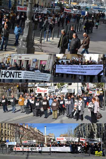 " signé "le Collectif National Non au 19mars 1962". Sur le torse des manifestants pacifiques mais déterminés, le message claque en rouge et bleu sur fond blanc. Le 19 mars 2013 , ils étaient nombreux femmes et hommes de diverses fédérations et associations de rapatriés, Pieds Noirs, Harkis et anciens combattants du département (accompagnés par Stéphane Ravier, conseiller régional FN), à se retrouver sur le Vieux-Port pour une "manifestation de deuil" jusqu'à la préfecture.