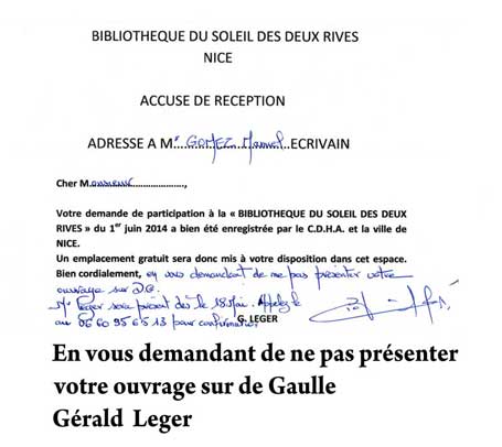 Je reçois ce jour une invitation à y participer mais à la condition expresse de ne pas présenter mon ouvrage sur De Gaulle, sur ordre de la mairie (pièce jointe).