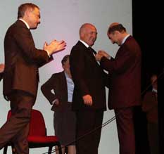 Lle congrès s’achève avec la remise des insignes de chevalier de la Légion d’honneur à Maurice Calmein, président fondateur du Cercle algérianiste, par Mohand Hamoumou. |
