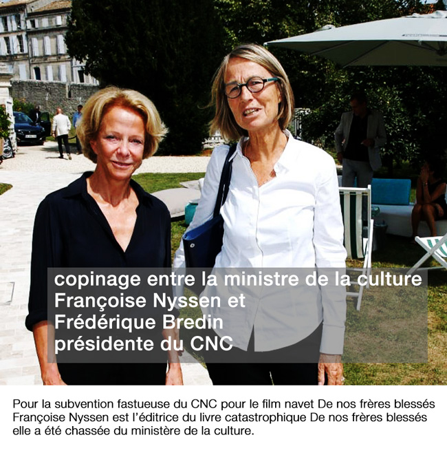 Le copinage entre la ministre de la culture Françoise Nyssen et Frédérique Bredin ancienne présidente du CNC pour la subvention fastueuse du CNC pour le film navet De nos frères blessés la ministre de la culture Françoise Nyssen est l’éditrice du livre catastrophique De nos frères blessés elle a été chassée du ministère de la culture.