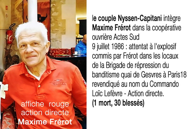 Le couple Nyssen-Capitani n'était pas non plus obligé de tendre la main à Maxime Frérot, ex-membre d'Action directe, doublement condamné à la perpétuité en 1989 et 1992. "Ils l'ont initié aux métiers du livre dans le plus grand secret lorsqu'il était en liberté conditionnelle, se souvient une personnalité de la ville. Sa peine purgée, ils l'ont intégré à la famille, invité à tous les dîners.