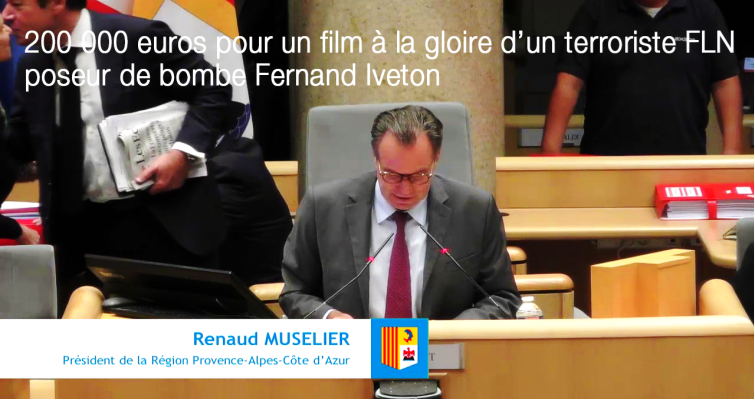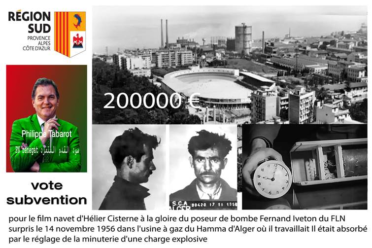 Le 18 octobre 2018 à l'initiative du LR Renaud Muselier et son pote Estrosi ont voté une subvention de 200 000 euros pour la réalisation d'un film à la gloire du terroriste Fernand Iveton ce militant communiste qui plaça une bombe dans l'usine à gaz du Hamma le pire c'est que cette subvention votée par tous à l'exception du RN l'a également été par des pieds-noirs renégats qui mangent dans la main de la doublette Estrosi-Muselier : il s’agit de Agnès Rampal Sylvaine Di Caro et Philippe Tabarot.