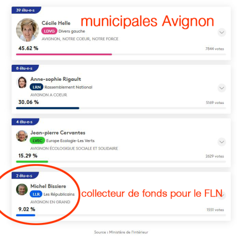 Michel Bissière enfin se présente à l’élection municipale en 2020 à Avignon avec un résultat décevant pour les nauséabonds LR de la Région PACA les soutiens du FLN.