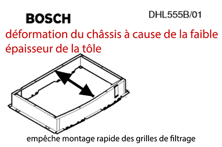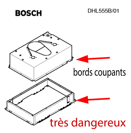Pose de la hotte avec de nombreuses difficultés prévues dans la notice du constructeur c’est-à-dire se munir de gants de bouchers métalliques pour sa pose ; recommandation ignorée et main gravement entaillée (étant sous traitement pour le cœur de longs écoulements de sang) pour pallier ce dangereux évènement et de l’incompétence dangereuse du fabricant BOSCH il suffit de frotter les bords du coffret avec de la paille de fer pour éviter les ébarbures qui dépassent dangereusement (2 minutes).