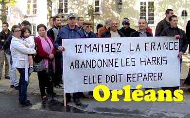 Une soixantaine de personnes représentant les harkis du Loiret ont manifesté aujourd'hui, à Orléans, pour réclamer le respect des promesses de François Hollande sur la reconnaissance de l'abandon par la France, à la fin de la Guerre d'Algérie, de ces supplétifs de l'armée française. Un échange de télégrammes entre les ministres Pierre Messmer et Louis Joxe avait scellé le refus de l'accueil des harkis en France après les accords d'Evian, signés en mars de la même année et mettant fin à la guerre.