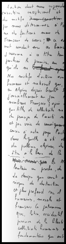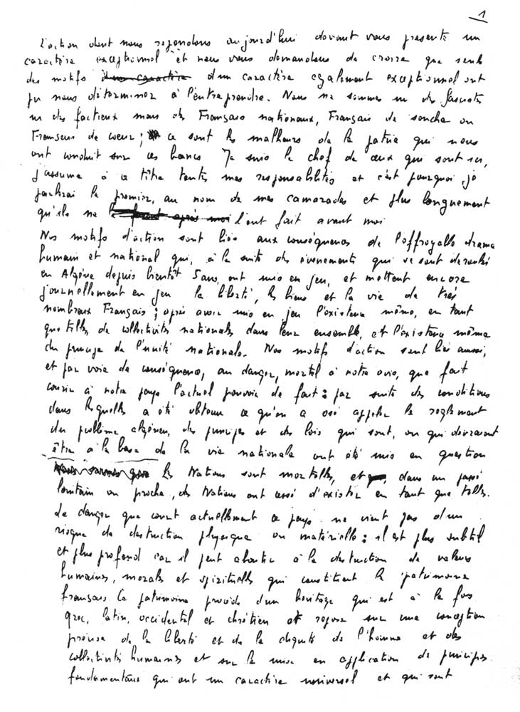 Nos motifs d'action sont ils aussi, et par voie de conséquence, au danger, mortel, à notre avis, que fait courir à notre pays l'actuel pouvoir de fait : par suite des conditions dans lesquelles a été obtenu ce qu'on a osé appeler le règlement du problème algérien, des principes et des lois qui sont ou qui devraient être à la base de la vie nationale ont été mis en question. Les nations sont mortelles et, dans un passé lointain ou proche, des nations ont cessé d'exister en tant que telles. Le danger que court actuellement ce pays ne vient pas d'un risque de destruction physique ou matérielle : il est plus subtil et plus profond car il peut aboutir à la destruction de valeurs humaines, morales et spirituelles qui constituent le patrimoine français.