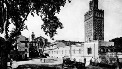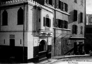 Avant la conquête espagnole, le fort se limitait à un ouvrage polygonal, le Bordj el-Mahal, le fort des cigognes .Les gouverneurs impériaux en firent le Rosalcazar. D'importants travaux de 1563 à 1710 en firent un hôtel des gouverneurs en style baroque. Une inscription surmonte la porte « Sous le règne de Charles III et sous le commandement de Don Juan Martin Zermeno, on fit cette porte, on construisit les voûtes pour le logement de la garnison, et l'on édifia le château qui regarde vers là mer ». Une inscription arabe la surmonte et donne l'année de la reddition d'Oran par les Espagnols, en 1206 de l'hégire (1792), sous le pacha d'Hassen. La grande mosquée, construite au XVIII ème siècle, commémore l'expulsion des Espagnols et fut construite avec les rançons des esclaves chrétiens. Sa cour contient une vasque de marbre blanc qui aurait été échangée en Espagne contre un chargement de blé. Autour du château neuf, bordée de palmiers de bellombras et de pins, a été tracée la promenade de Létang, du nom d'un général ayant commandé la division d'Oran Dans la rue Philippe, se trouve l'ancienne maison du dey Hassan, bâtie en 1812, de style hispano-mauresque. |